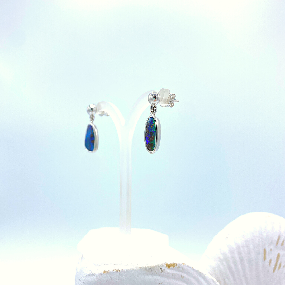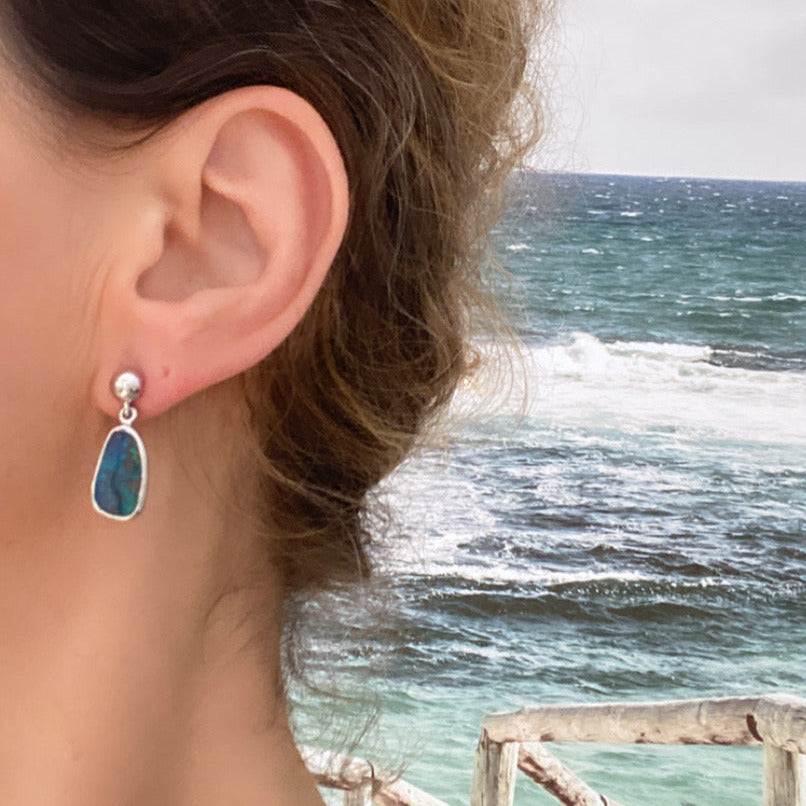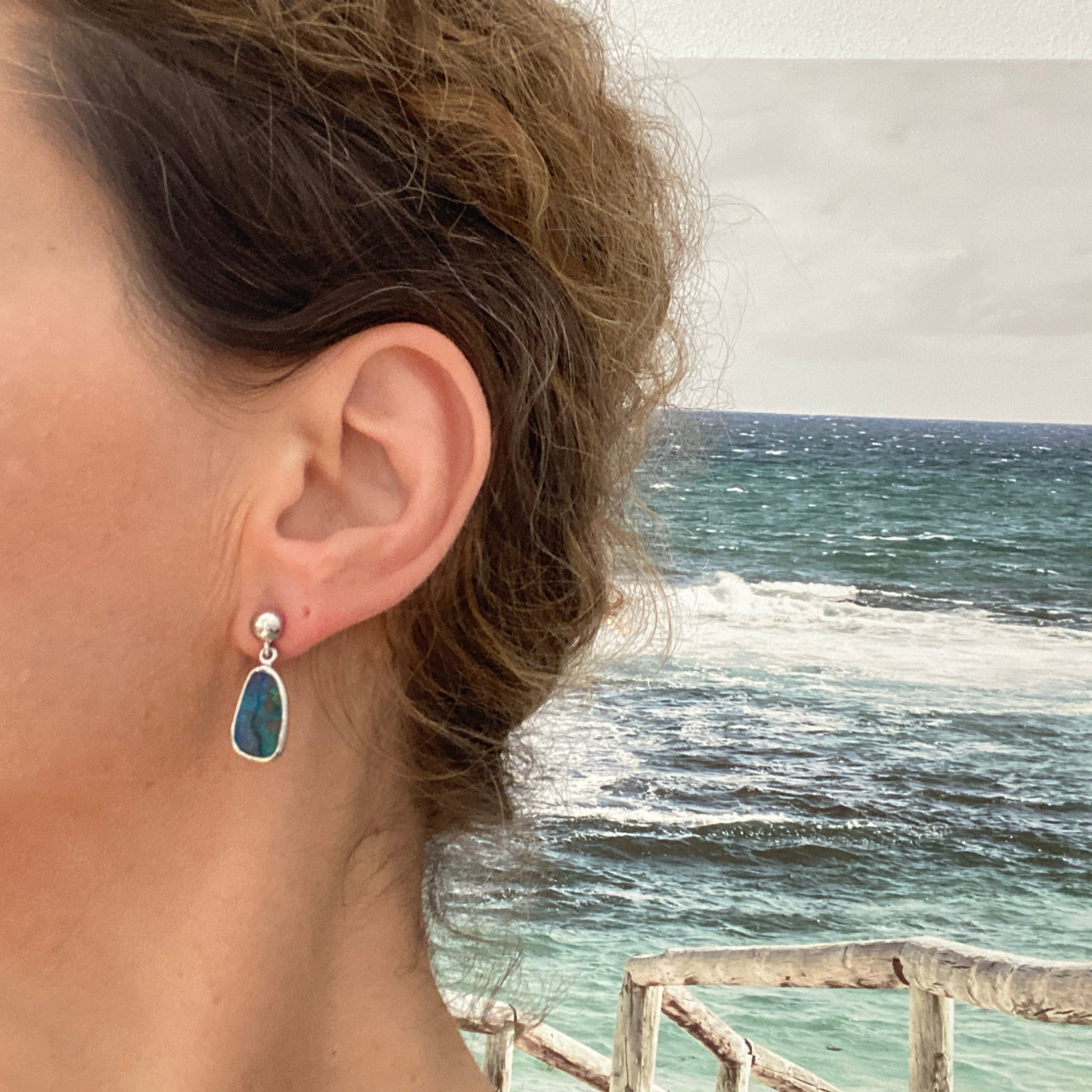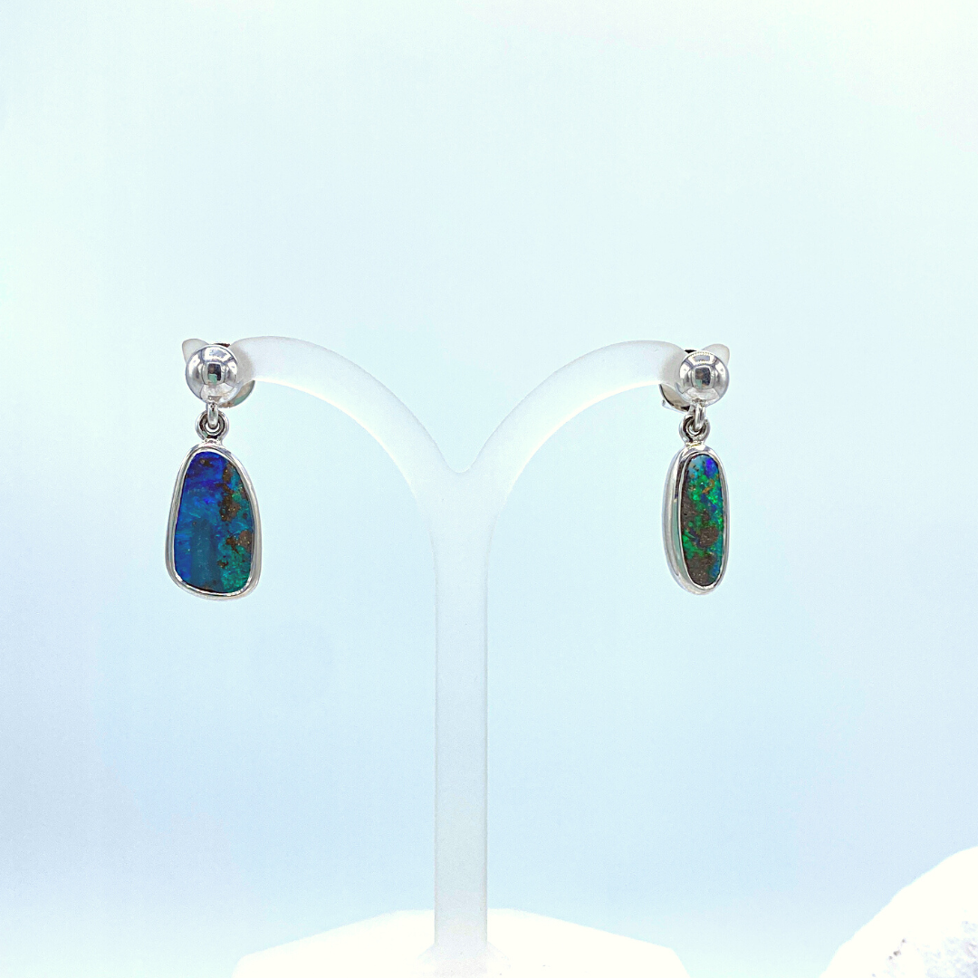 Müssen Ohrringe nicht immer perfekt gleich sein? Oh nein! Dieses Paar Ohrhänger tritt den Beweis an: Gleich, unterschiedlich und so ein perfektes Paar. Das mysteriöse Blau und Grün wird in diesen einzigartigem Ohrschmuck perfekt in Szene gesetzt. Die schönen Ohrstecker werden ganz von den großen Opalen geprägt, die sich minimalistisch und pur präsentieren. Außergewöhnlich und sehr gekonnt.